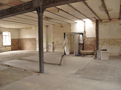 Trockenbau und Elektroinstallation im ersten Obergeschoss des Südflügels. Hier wird ein Künstleratelier entstehen. |