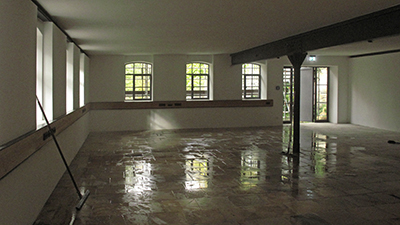 Endreinigung der Sonthofener Fußbodenplatten im Getreidelager OG. Auf der Terrasse über dem Getreidelager: Putz- und Malerarbeiten an der Fassade des Südflügels. |