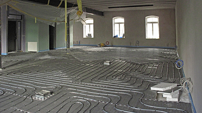 Verlegung der Fußbodenheizung im Dachgeschoss des Brauhauses. |