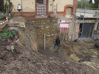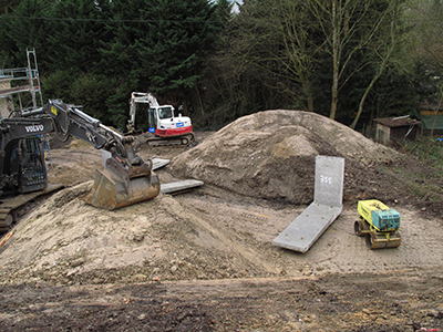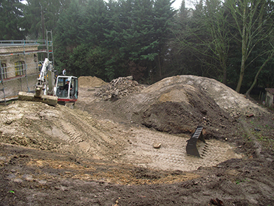 30.01.2020 Fertigbetonteile zur Abstützung der Terrasse im Bereich des Pferdestalls, schichtweise Aufschüttung und Verdichtung mit Erdmaterial. |
