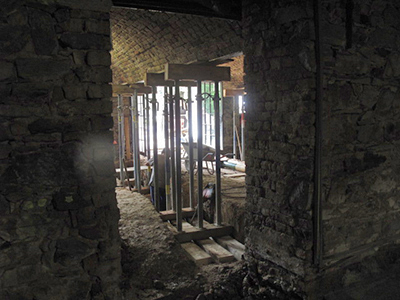 Im "Vinotto" sind die gewölbetragenden Säulen entfernt. Während vorne noch ausgeschachtet wird, ist im hinteren Gewölbe bereits die neue Fußbodenplatte gegossen. |