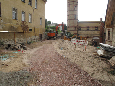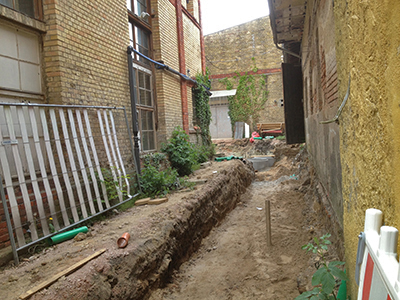 24.04.2017 Grabungsarbeiten für die Verlegung der Versorgungsleitungen im Bereich zwischen Sudhaus, Malzhaus und Kühlschiff ("Scheune"). |