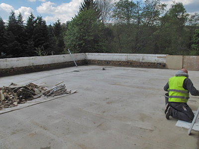 28.04.2017 Herstellen der Abdichtungen zu den Außenwänden auf der frisch gegossenen Terrasse des Getreidelagers. |
