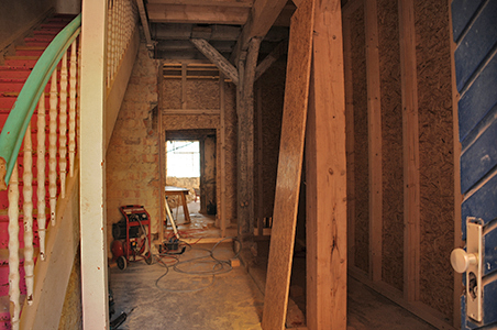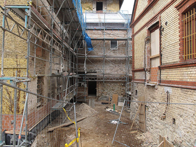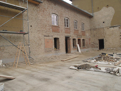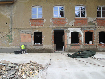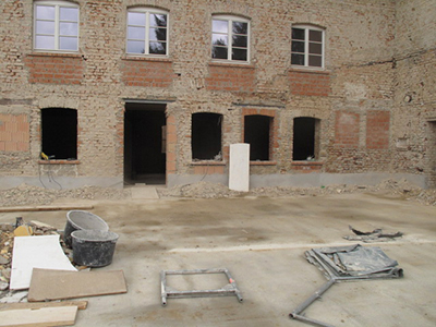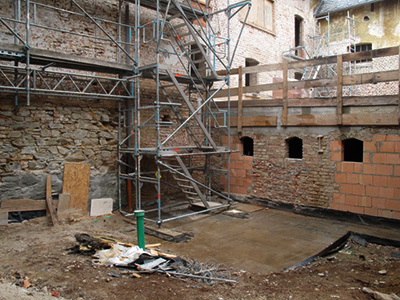 Der Südflügel von der Terrasse aus gesehen. Auch hier wird der alte Wandputz von den Fassaden entfernt und lässt das alte Ziegelmauerwerk zutage treten. Gut zu erkennen: die im Obergeschoss bereits eingesetzten neuen Holzrahmenfenster. |