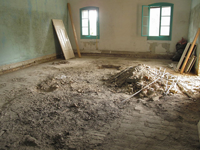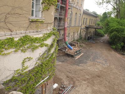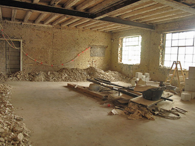 Malzhaus Erdgeschoss: Der Wandputz in unserem ehemaligen Ausstellungsraum ist entfernt, und wird wie so unendlich viele Tonnen von weiterem Schutt nach außen in Container entsorgt. |
