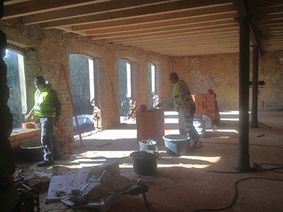 16.02.2017 Aufmauern der Fenstersimse im Obergeschoss des Südflügels. |