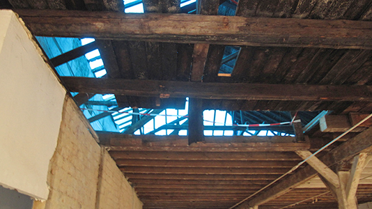 10.02.2017 Blick vom Obergeschoss des Malzhauses durch die zu erneuernde Geschossdecke in den Dachstuhl. |