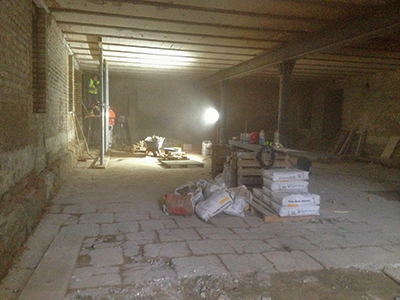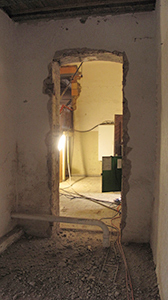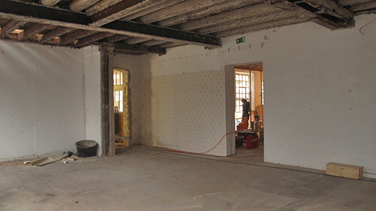 Ehemaliger Ausstellungsraum des Künstlervereins im Erdgeschoss des Malzhauses. Hier wird ein neues Künstleratelier entstehen. Links sichtbar: Ein neu geschaffener Durchbruch zum Turm, in dem sich später das zentrale Treppenhaus befinden wird. |