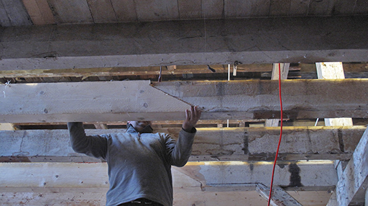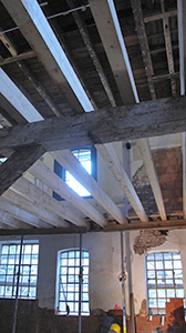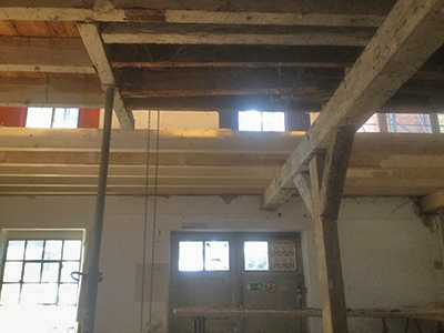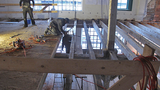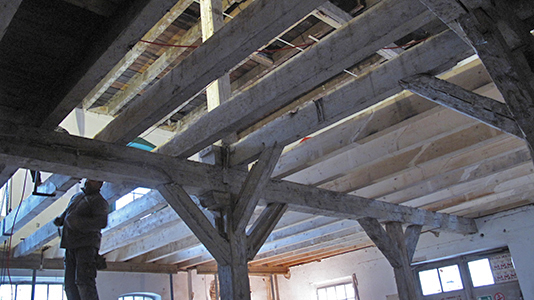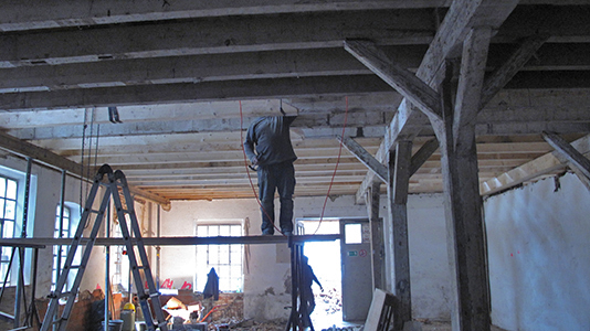 Feinste Zimmermannsarbeit: Erneuerung eines Großteils der Deckenbalken zwischen Erdgeschoss und Obergeschoss des Malzhauses. |
