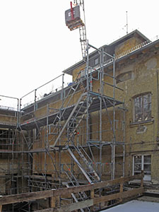 Durch eine extra in der Dachfläche geschaffenen Öffnung werden mit dem Kran Materialien in das Dachgeschoss des Südflügels transportiert. |