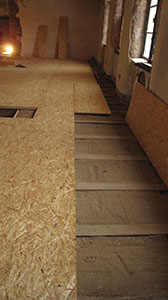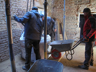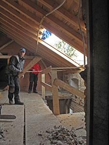 24.01.2017 Natürliche Dämmung: Ein Gemisch aus Lehm und Späne wird als Dämm- und Isolationsschicht zwischen die Balken der Geschossdecke im Südflügel eingebracht. |