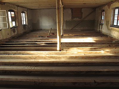 Links: Erdgeschoss des Mühlengebäudes mit neuem Fenstersturz und neuem Fenster. Rechts: Freigelegte und sanierte Geschossdecke im Südflügel, bereit für die Aufnahme einer Dämmschüttung. |
