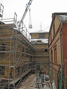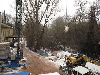 Der Weg des Materials per Kran: Große Säcke mit Dämmmaterial werden durch eine Öffnung im Dach in den Südflügel transportiert ... |