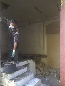 05.11.2018 Der Abbruch der Bodenplatte und des alten Sockels unter der Treppe im vorderen Bereich des Pferdestalls. Der Übergang zum restlichen Teil des Bildhauerateliers von Christiane Erdmann ist provisorisch abgedichtet. |
