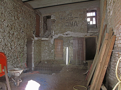 06.01.2019 Links: Das spätere Atelier im Malzhaus EG hat seine erste Putzschicht erhalten. Rechts: Das künftige Gemeinschaftsatelier im Dachgeschoss des Pferdestalls ist bereit für die abschließende Feinestrich-Schicht. |