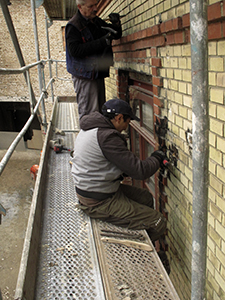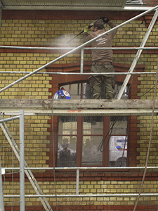 06.03.2019 Mühlenhaus: Fassadenreinigung mit Wurzelbürste und Kärcher. Besondere Mühe machen dabei die Reste des Bitumens, mit dem seinerzeit der hässliche Übergang zwischen Mühlenhaus und Malzhaus "angeklebt" war. |