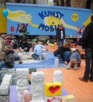 Seit 2004 kommen die kunstwerker auf Wiesbadener Spielplätze und bringen mit mobilen Kunstwerkstätten Kunst zu Kindern und Jugendlichen. Anfänglich mit einem großen Bauwagen, dem KUNSTMOBIL, dann auch mit festen KUNST-Containern, die eine regelmäßige Arbeit ermöglichen. Wöchentlich werken, malen, bauen zurzeit ca. 160 Kinder in 8 Werkstätten in 8 Stadtteilen. Die Kinder erfahren hier Anerkennung und Förderung ihrer eigenen Fähigkeiten und lernen sich selbst etwas zuzutrauen.