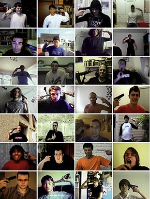 Um gespielte Hinrichtungen geht es auch in der Arbeit von Paul Altmann. Er hat sich in den Weiten des Internets auf die Suche gemacht und Bilder gesammelt, auf denen Männer mit Handfeuerwaffen posieren und sich ablichten lassen, als wären sie gerade unmittelbar vor einer Selbsttötung. Die Mündung der Waffe an der Schläfe, im Mund oder zwischen den Augen. Unter den vielen seltsamen Communities, die sich im Netz zusammenfinden, gibt es tatsächlich auch welche die mit der ultimativen Autoagression spielen. Spätestens an dieser Stelle wird in der Ausstellung klar, dass das Spiel nicht immer nur heiter und schöpferisch ist, sondern auch zerstörerisch und gefährlich werden kann. Spiele können Gewaltphantasien ausdrücken und reale Gewalt vorbereiten. Sie können aber auch aggressive Triebe kanalisieren und im Spiel sublimieren.