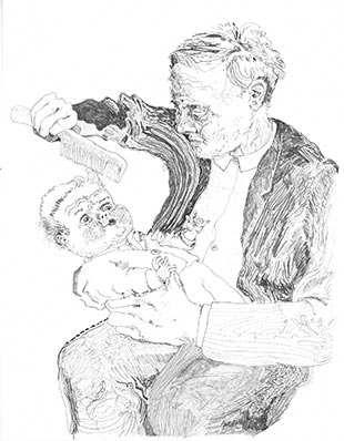 Auf den Zeichnungen von Peter Torp verhalten sich alte, hässliche Männer wie Kinder. Sie baden und kämmen Puppen. Sie spielen mit Geschirr und großen Bällen oder malen gedankenverloren wirre Linien in ein Schulheft. Beunruhigend und abstoßend sind nicht nur die wulstigen Lippen und fleischigen Hände, sondern auch der Kontrast zwischen der ernsthaften, korrekten Kleidung die Männer erscheinen alle in Sakko und Krawatte und dem kindischen Tun.