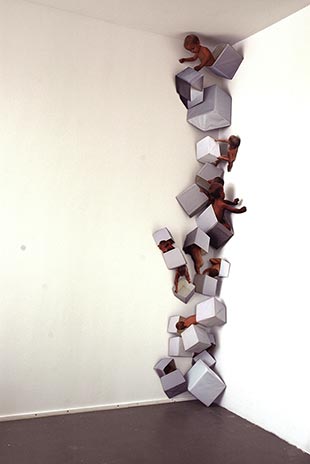 Susanne Wadle verarbeitet Kinderspielzeug, genauer Barbiepuppen in ihren alptraumhaften »Blüten«. Zu mehreren zusammengepackt, Kopf und Rumpf in einer rosafarbenen Masse verborgen, ragen Arme und Beine wie fleischige Blütenblätter aus einer unheimlichen Pflanze heraus. Die Gruppe aus wahnhaften Topfpflanzen lässt Barbie zur fleischfressenden Pflanze mutieren, die sich gerade selbst verspeist. Eine zweite Arbeit hat das Hinein- und Hinauskriechen des Kleinkindes zum Thema. »Simon« krabbelt die Wand hoch, verkehrt dabei oben und unten, entdeckt die Welt und stellt die unsrige auf den Kopf.