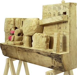 Auch Andreas Welzenbach schafft witzige und niedlich anzusehende Holzarbeiten, die ebenfalls abgründige und bitterböse Beobachtungen und Gesellschaftschilderungen zeigen. Ein Spielzeug, das vom Betrachter in Gang gesetzt werden kann, zeigt er in dieser Ausstellung: »Jackies Kostüm oder die Überprüfung einer Theorie« ermöglicht es dem Betrachter selbst das Attentat auf J.F.K. nachzuspielen. Eine Holzkugel, die man ins Rollen bringt steht für die Gewehrkugel des angeblichen Todesschützen. Sie rollt durch eine Modelllandschaft um schließlich, nach einer Richtungsänderung um 180 Grad den Kopf des Präsidenten von vorn zu durchschlagen.