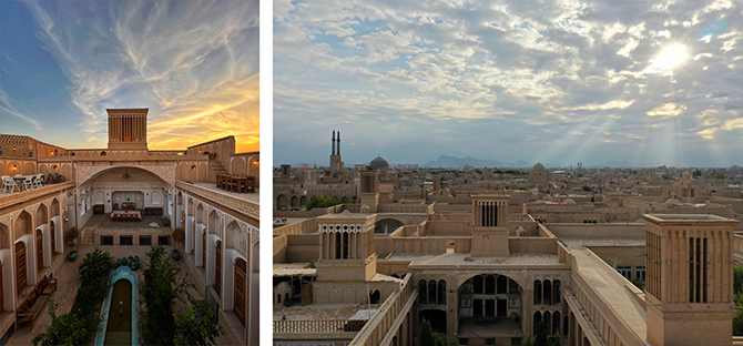| Rechts: Historische Altstadt von Yazd. Foto: Baharak Roshanbakhsh. Creative Commons License CC0 1.0. Historisches Lehmhaus in Yazd. Foto: Baharak Roshanbakhsh. Creative Commons License CC0 1.0. |